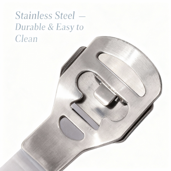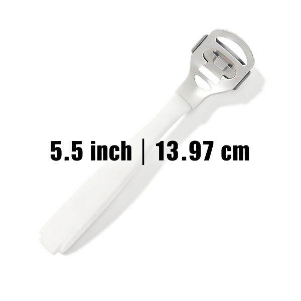 Crafted with a durable white ergonomic handle, this foot scraper features a polished stainless steel blade holder and a slide-lock blade attachment system for quick and secure blade changes. The interchangeable double-sided blade design ensures maximum usability and longevity.