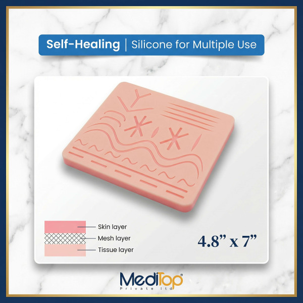 Suture training pad is designed to replicate the anatomical structure of human tissue including 3 layers, skin, fat and muscle, to provide the best human tissue simulation possible. The silicone pad has a hidden protective mesh layer between the skin layer and the fat layer. This makes the pads more durable and long-lasting.