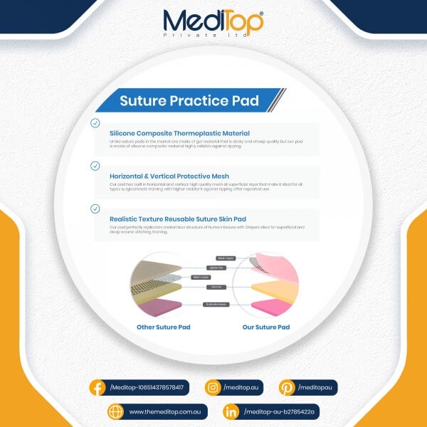 - 100% SILICONE REUSABLE SUTURE PAD- MEDITOP high-quality silicone suture pads should offer the right amount of tension and resistance to hold up to a normal degree of pulling. Higher quality materials also allow students to continue to practice on the same pads without having to work around cumbersome gashes in the test material.