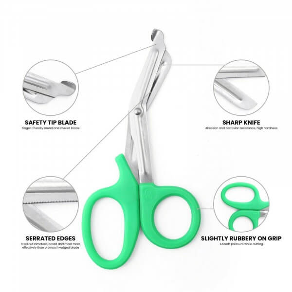 - Bottom blunt tip of the Utility Bandage Scissors slides easily under bandages making bandage removal safe, easy and quick