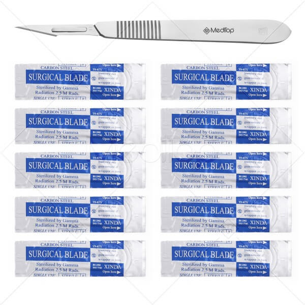 This scalpel set includes a high-quality stainless steel handle (size #3) and 10x individually wrapped sterile #11 carbon steel blades, designed for surgical, crafting, or precise cutting tasks. This economical alternative to disposable scalpels ensures accuracy, control, and durability with every use.